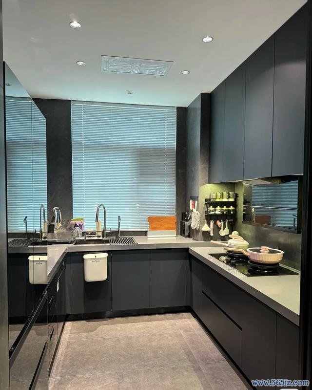 橱柜U型边幅,柜门深灰色平板门,比拟耐脏!台面高下台联想,使用便捷!雪柜联想在掌握!
