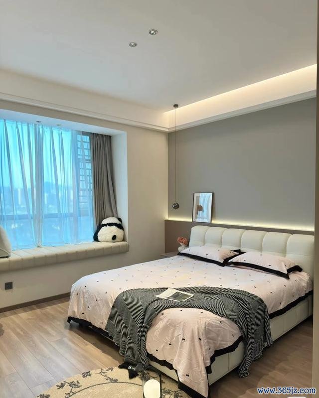 卧室大地通铺暖色木地板,床头布景墙咱们来望望具体怎样作念的,木饰面作念半高墙,上半部分刷的灰色乳胶漆。主卧亦然无主灯联想,飘窗保留,定制飘窗垫,窗帘一层纱一层帘。